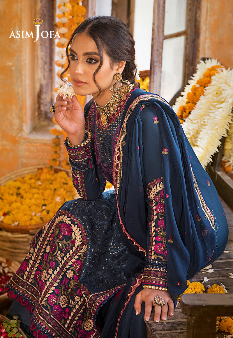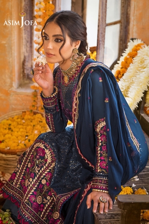 Surrounded by colorful flowers Iqra Aziz wins hearts dressed in this deep teal blue ensemble. Filigree aari work adorns the shirt with gold sequins highlighting on every turn topped with a wide heavy neckline & colorful borders complementing the monochromatic all over embroidery of shirt. Its paired with an elaborately embroidered chiffon dupatta & dyed cotton pants.
