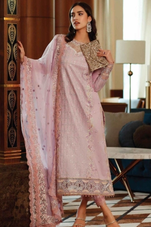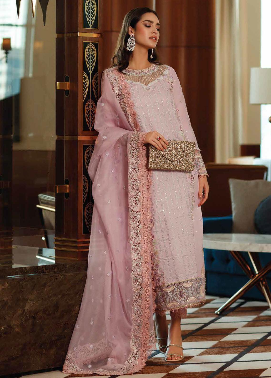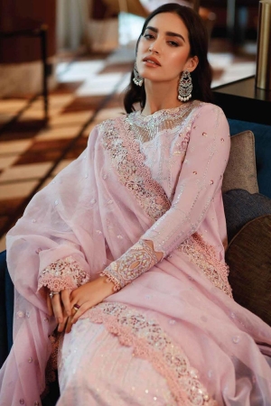 Capture the essence of ethereal beauty with our baby pink ensemble, “Kenza”, where delicate silver embellishments interweave like tendrils of ivy. The embellished border of the dupatta adds a touch of whimsy to your ensemble.