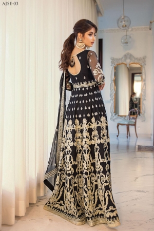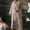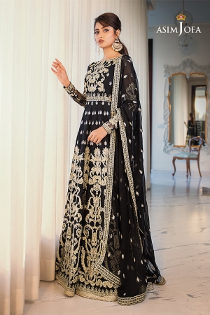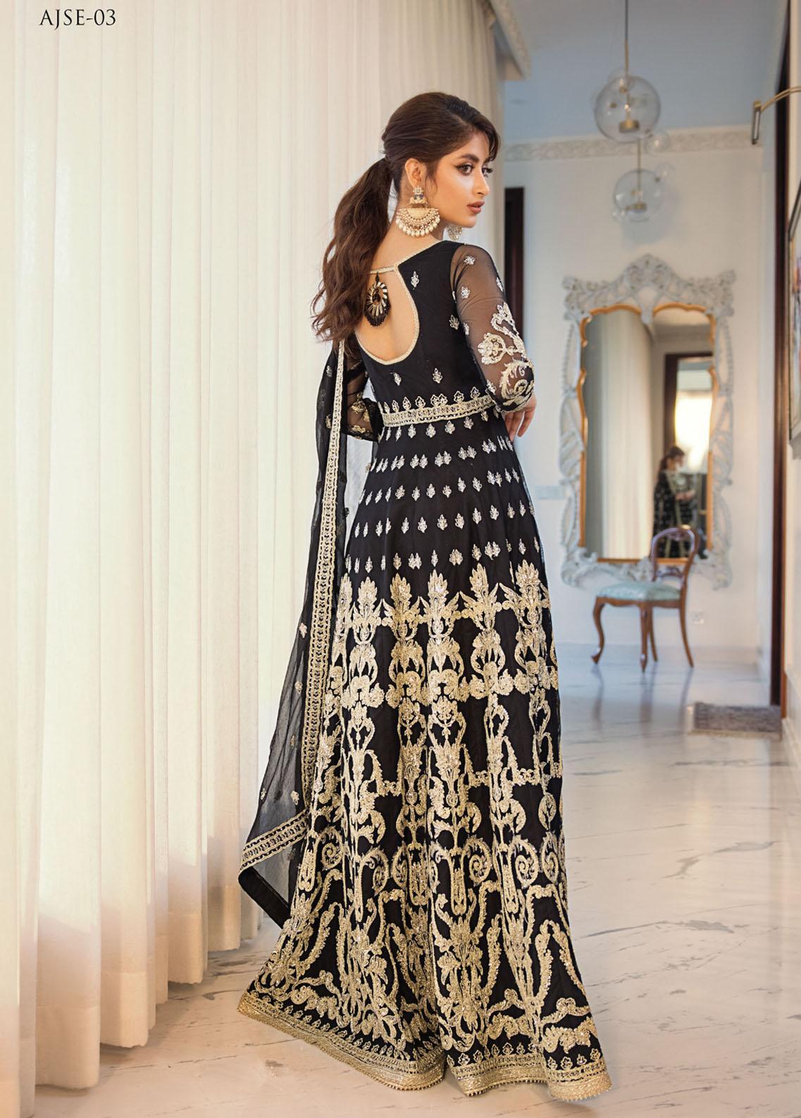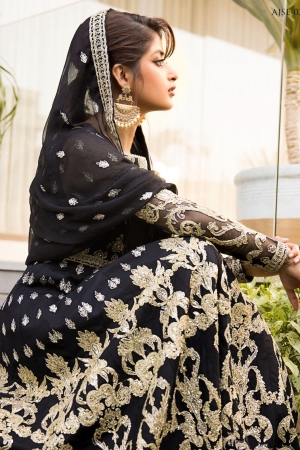 Sajal Aly creates an iconic statement and evokes old world charm in this gorgeous attire. The ensemble features an impeccable rendition of banarsi dori work sprawled on obsidian tulle which is stylized into a flared kalidaar. The look is further accentuated with a heavily decked up hemline featuring baroque inspired embroidery. Accompanying the look is a complimenting dyed solid silk pants and a heavily embroidered chiffon dupatta.