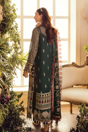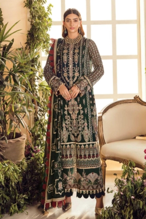 A Rich Sacramento Green Canvas Comprises Of A Floating Ethnic And Geometric Elements Which Are Highlighted With An Accent Of A Contrasting Deep Maroon Hue Which Stands Out On Its Own. A Raw Silk Bottom And A Chiffon Dupatta That Is An Amalgamation Of An Overall Scrolling Embroidered Details.