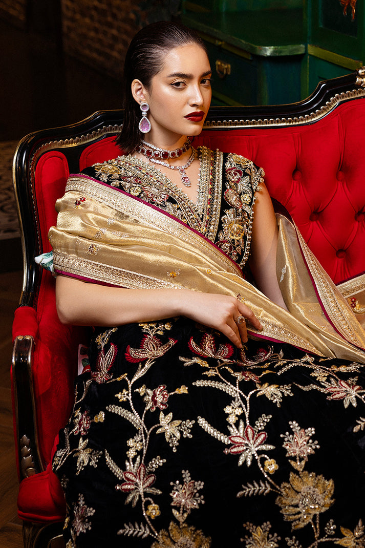 With rich velvet, intricate embroidery, sequins, and hand embellishments, it captures timeless romance. The zari dupatta, edged with sequined lace, and raw silk trousers, finished with pearls, add a regal touch to this exquisite piece.