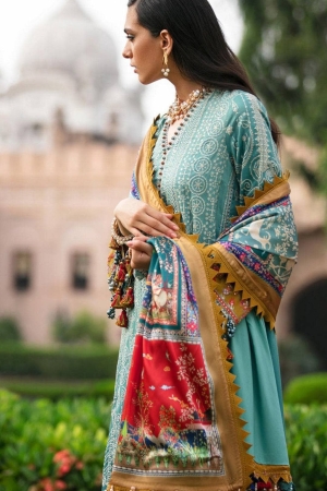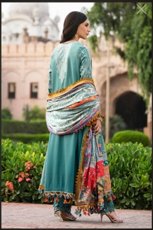 Propagate utter grandeur in digitally printed tye & dye in shades of sea green on a raw silk base. A finely crafted outfit with an extravagant and hypnotically poetic embroidery of resham and sequin. Paired with matching pants and a mystically printed shawl.